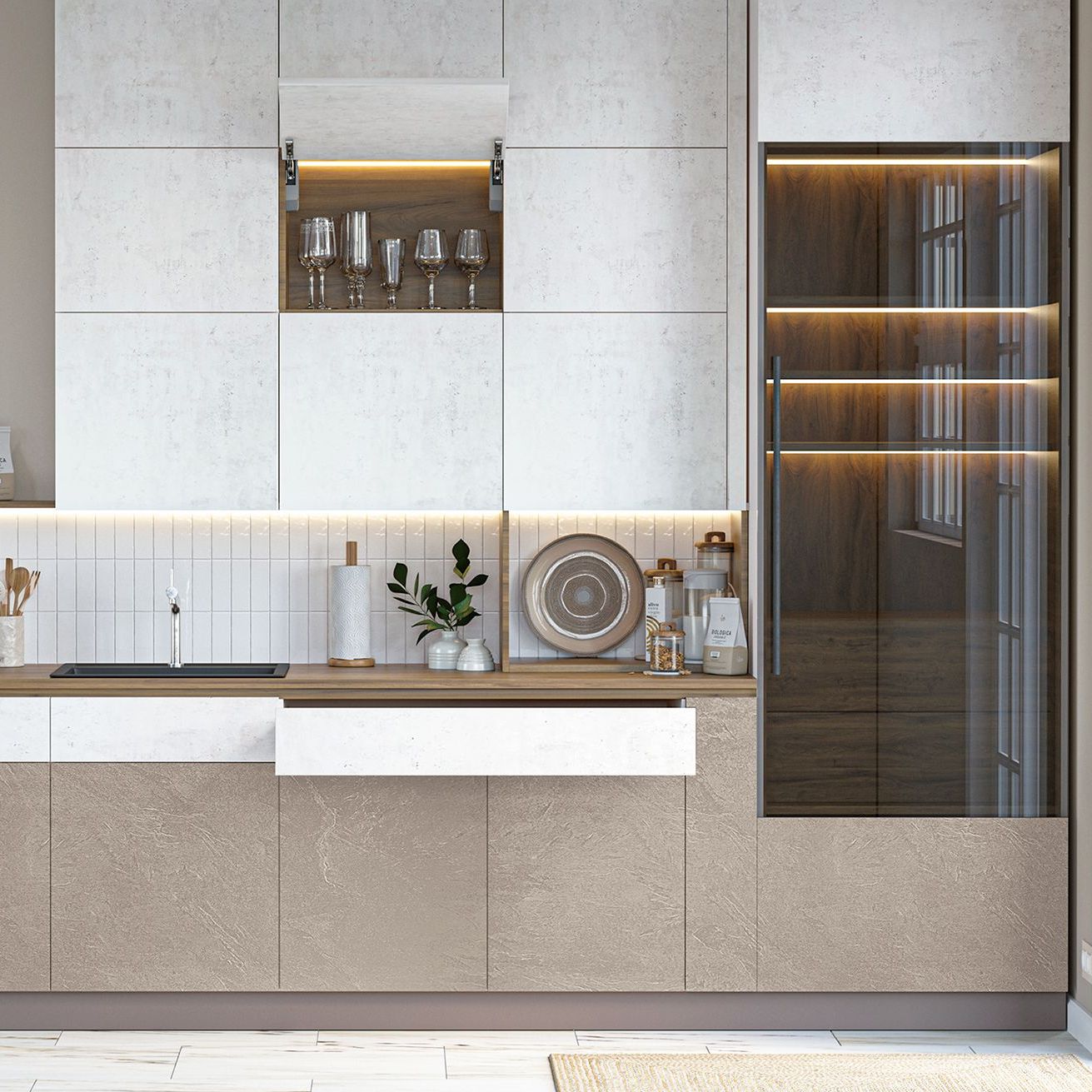 Мебельные фасады SynchroWood -поверхность фасадов имитирует натуральные поверхности не только визуально, но и тактильно. Это достигается за счет уникальной технологии прессования бумажно-слоистого пластика.